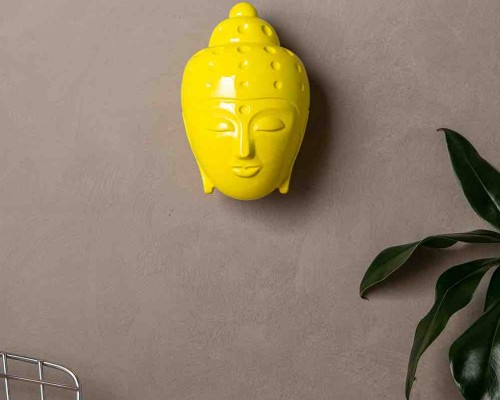 Contemporary Buddha head sculpture - painted in yellow automotive paint, 2020